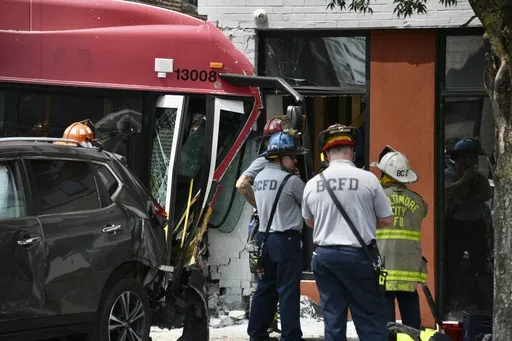 BALTIMORE (AP) — Sixteen people were injured Saturday when a mass transit bus crashed with two cars before hitting a building in Baltimore, authorities said.