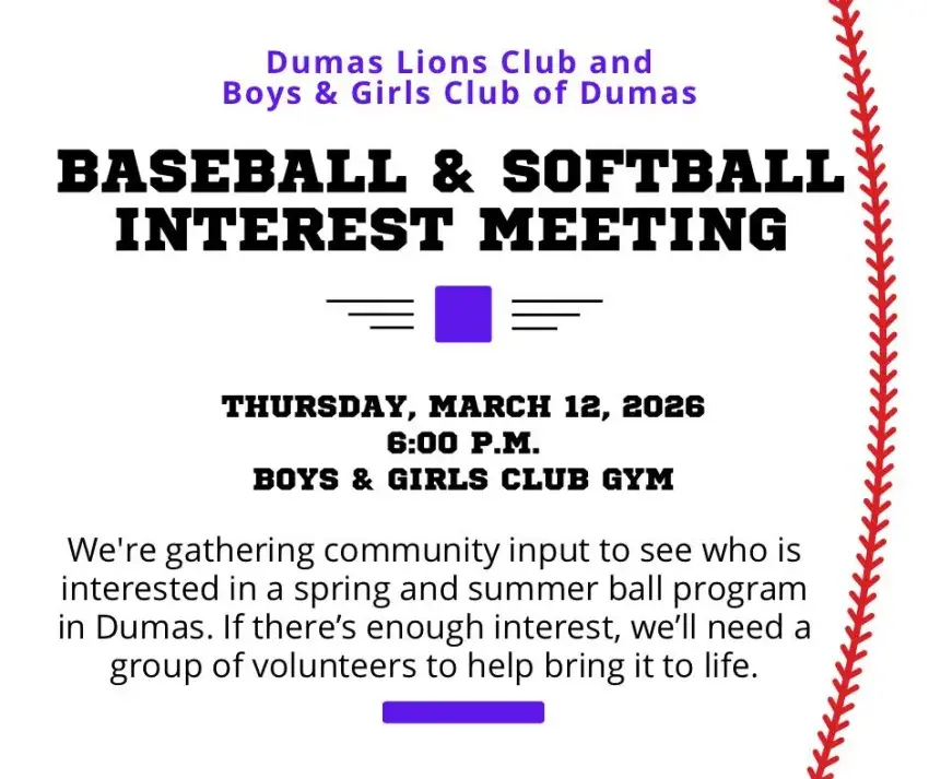 © Copyright 2026 The Dumas Clarion 136 East Waterman St.- Dumas, Arkansas 71639 - (870)382-4925  | Terms of Use | Privacy Policy