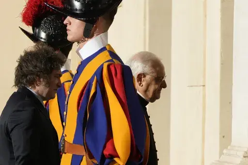 The Vatican said the two men met for an hour and 10 minutes, an unusually long audience by Francis’ standards, especially given no translation was required. Vatican video showed a smiling Francis briefly grasping Milei's arm for support as they walked to his desk at the start of their meeting.