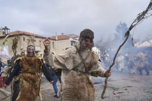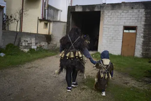 Clad in sheep and goatskins with heavy hand-forged bronze bells chained to their waists, the Bell People danced through the streets Monday of this red-roofed village, a two-hour drive northwest of Athens.