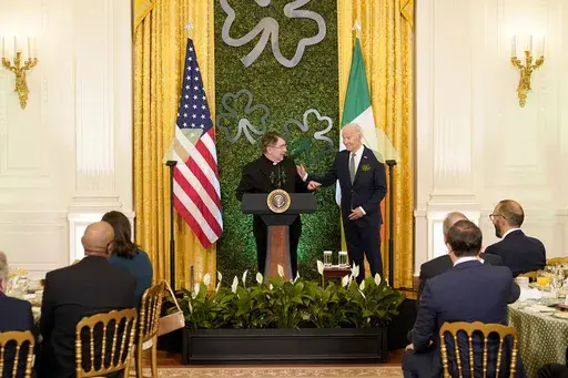 In Washington, President Joe Biden held a St. Patrick’s Day brunch for Catholic leaders in the East Room on Sunday. The room was decked out for the holiday, with an Irish flag, shamrocks and green and gold tablecloths. Guest seating cards were written in Celtic-looking green lettering.