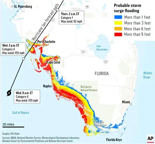 The hurricane was lashing the state with heavy rain and pushing a devastating storm surge after strengthening to the threshold of the most dangerous Category 5 status. Ian grew to a catastrophic Category 4 hurricane overnight with top winds of 155 mph (250 kph), according to the National Hurricane Center.