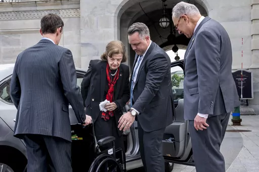 Looking noticeably thinner and frail, Feinstein is using a wheelchair to get around the Capitol as she continues to recover from a case of shingles. She missed the Senate’s first votes on Wednesday morning but arrived outside the Senate in a car for an afternoon vote, helped into the wheelchair by aides and greeted by Senate Majority Leader Chuck Schumer with a handshake and affectionate pat on the back.