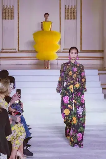 Gordon's signature Herrera aesthetic was on display in a yellow tulle dress with a tiered skirt that bounced as the model strutted down the ballroom. Another look that bought drama and intrigue was yet again a tiered black and white tulle dress — some of the nylon tulle covered the model's face, giving mystery to the look.