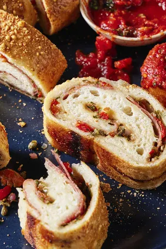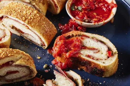 Stromboli is an Italian-American invention said to have been created in Philadelphia in the 1950s, but the dish takes its name from an island off the coast of Sicily. Like the calzone, it’s a sort of portable pizza — fillings are enclosed in dough and baked — but more often than not, stromboli is cylindrical. In this recipe from our cookbook “ Milk Street Bakes,” a sheet of yeasted dough is topped with ingredients, then rolled up and slid into the oven. We use two melty cheeses and sliced salami, all of it layered on a bed of chopped vegetables and herbs. Capers provide brininess; roasted peppers, onion and parsley balance the richness of the meat and cheese. Don’t fill and roll the dough on the counter. The unbaked stromboli is awkward and difficult to transfer, so it’s best to work directly on the baking sheet. After rolling, don’t fold the edges of the stromboli under, or the ends will be too thick and bready. Instead, simply pinch the edges to seal. Finally, be sure to reposition the stromboli diagonally on the baking sheet to give it some room to expand during baking. Slicing reveals tasty spirals of bread and filling. The stromboli is fantastic warm, when the cheese is gooey, but also is delicious at room temperature. Salami and Cheese Stromboli Start to finish: 3½ hours (40 minutes active), plus cooling Servings: Makes one 16-inch stromboli, serving 6 to 8 Ingredients: 445 grams (3¼ cups) bread flour, plus more for dusting 1 teaspoon white sugar 1¼ teaspoons table salt 1 teaspoon instant yeast 2 tablespoons extra-virgin olive oil 1¼ cups warm water (100°F to 110°F) ¾ cup drained roasted red peppers, patted dry and chopped ¼ cup finely chopped red onion 3 tablespoons drained capers, patted dry and chopped ½ cup lightly packed fresh flat-leaf parsley, finely chopped ¼ to ½ teaspoon red pepper flakes 1 tablespoon balsamic vinegar 4 ounces thinly sliced salami 4 ounces sliced provolone cheese, each slice cut into a half circle 4 ounces whole-milk mozzarella cheese, shredded 1 large egg, beaten ½ ounce Parmesan cheese, finely grated (¼ cup) Spicy tomato-basil sauce (recipe follows), to serve (optional) Directions: In a stand mixer with the dough hook, mix the flour, sugar, salt and yeast on medium until well combined, about 15 seconds. With the mixer on low, drizzle in the oil followed by the water. Scrape the sides of the bowl. Mix on medium, occasionally scraping the sides of the bowl as well as the hook, until the mixture forms a cohesive, slightly sticky dough that clears the sides of the bowl, 4 to 6 minutes; the dough will not be completely smooth. Using a silicone spatula, scrape the sides of the bowl and gather the dough in the center. Cover with plastic wrap and let rise at room temperature until doubled, 1½ to 2 hours. Meanwhile, in a small bowl, stir together the roasted peppers, onion, capers, parsley, pepper flakes and vinegar; set aside. About 30 minutes before you are ready to shape and fill the dough, heat the oven to 450°F with a rack in the middle position. Mist a 13-by-18-inch rimmed baking sheet with cooking spray, then line it with kitchen parchment. Mist the parchment, then dust with flour. When the dough has doubled, turn it onto the prepared baking sheet. With the long edge of the baking sheet nearest you, use lightly oiled hands to press and stretch it into an even layer that covers the surface of the baking sheet; it’s fine if the dough doesn’t completely fill the corners. Using a large slotted spoon, spread the roasted pepper mixture in an even layer over the dough, leaving a 2-inch border at the top and a 1-inch border on each short side; discard any liquid remaining in the bowl. Lay the salami slices over the pepper mixture, overlapping them to fit. Layer on the provolone slices, then sprinkle evenly with the mozzarella. Lift up the edge of the parchment closest to you and use it to help fold about 1 inch of the dough over the filling. Continue to roll the dough, without the parchment, until you reach the far edge. Pinch the seam to seal, then pinch the open ends (do not fold them under). Roll the stromboli seam side down and carefully reposition it diagonally on the baking sheet, making sure the seam remains on the bottom. Brush the top and sides with beaten egg and sprinkle evenly with Parmesan. Using a sharp paring knife, cut 5 or 6 shallow diagonal slashes, evenly spaced, into the top so the filling is visible. Bake until well browned and some of the cheese is bubbling through the slashes, 25 to 30 minutes. Using a wide metal spatula, transfer the stromboli to a cutting board and cool for 15 minutes. Use a serrated knife to cut into slices. Spicy Tomato-Basil Sauce Start to finish: 20 minutes Makes about 1⅓ cups In a medium saucepan over medium, combine 1 tablespoon extra-virgin olive oil and 1 medium garlic clove (minced). Cook, stirring occasionally, until the garlic just begins to brown, 1 to 2 minutes. Stir in ½ teaspoon red pepper flakes, followed by one 14½-ounce can whole peeled tomatoes (crushed by hand) with juices, ¼ teaspoon white sugar and ¼ teaspoon each kosher salt and ground black pepper. Bring to a simmer and cook, uncovered and stirring occasionally, until the sauce is lightly thickened, 8 to 10 minutes. Off heat, stir in 2 tablespoons finely chopped fresh basil. Taste and season with salt and black pepper. —— EDITOR’S NOTE: For more recipes, go to Christopher Kimball’s Milk Street at 177milkstreet.com/ap
