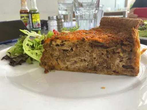 Breakfast/brunch hot spot 5 Points came up with Tamal Niangao — charred, sticky masa cakes with chorizo, green onion, Napa cabbage and chilies in a soy maggi glaze. Jicama, cilantro and two poached eggs are then piled on.