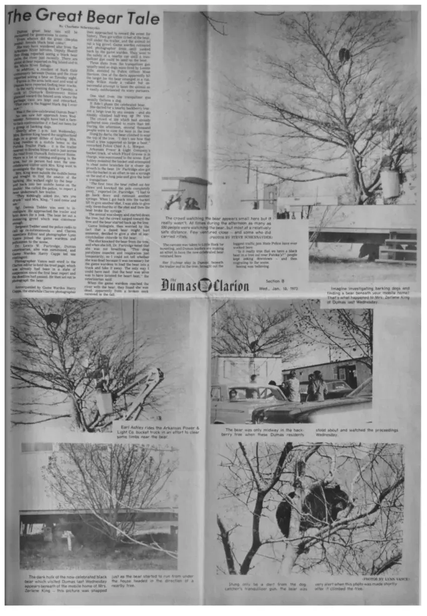 On January 3, 1973, a large black female bear wandered into town and found refuge under the house trailer belonging to Mrs. Zerlene King. The bear quite possibly, had awakened and realized that it was hungry. We'll never know how far it had traveled and why he stopped at Mrs. Kings house. Dogs were barking and Mrs. King looked under her house and saw the bear. The first person she called asked her if she had been drinking! The next person she called was Charlotte Schexnayder/Editor of the Dumas Clarion. (it was paper day) Ms. Charlotte prompt1y walked to the back of the Clarion and said" Stop the presses. We have a story. Melvin, get the camera." By the time the Schexnayders got to the trailer park a lot of people were already there. After an hour the bear emerged and a person from the Game and Fish Commission used a tranquilizer gun to daze the bear. The wounded bear fled as did the many spectators. The bear fled toward what was Hwy. 54. En route, Jody Wilkin tried to lasso the bear but failed.