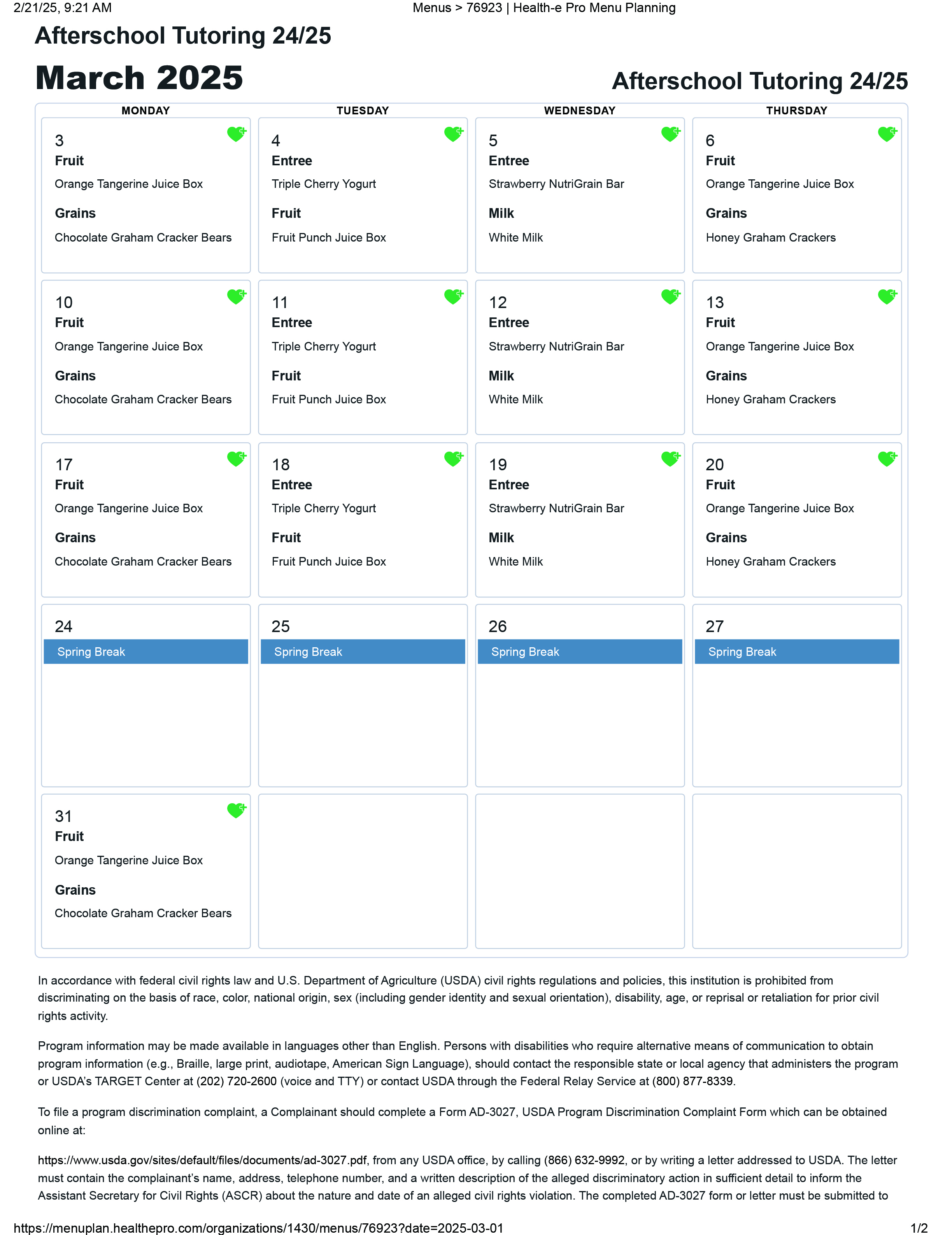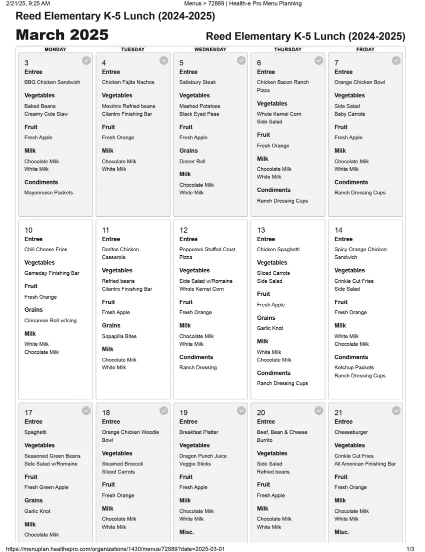 Tuesday, March 4- Entree-Chicken Fajita Nachos, Vegetables- Meximix Refried beans, Cilantro Finishing Bar, Fruit- Fresh Apple & Fresh Orange, Milk- Chocolate Milk & White Milk
