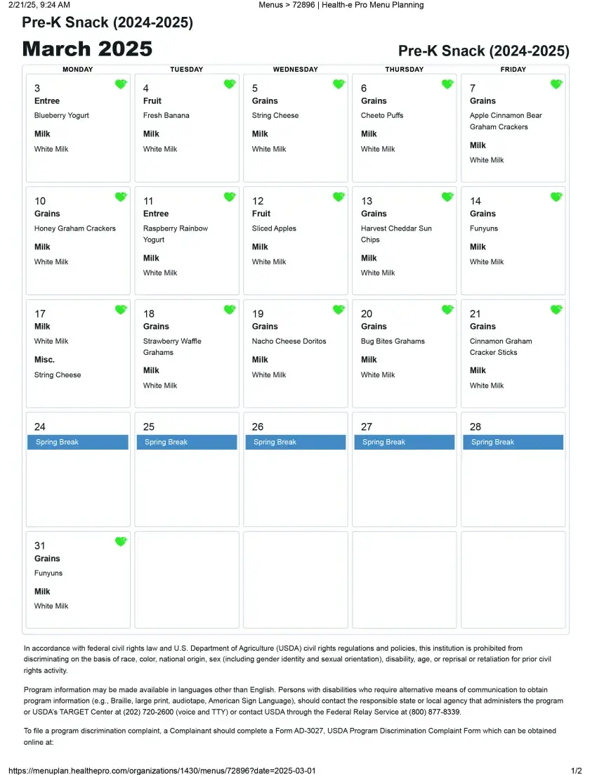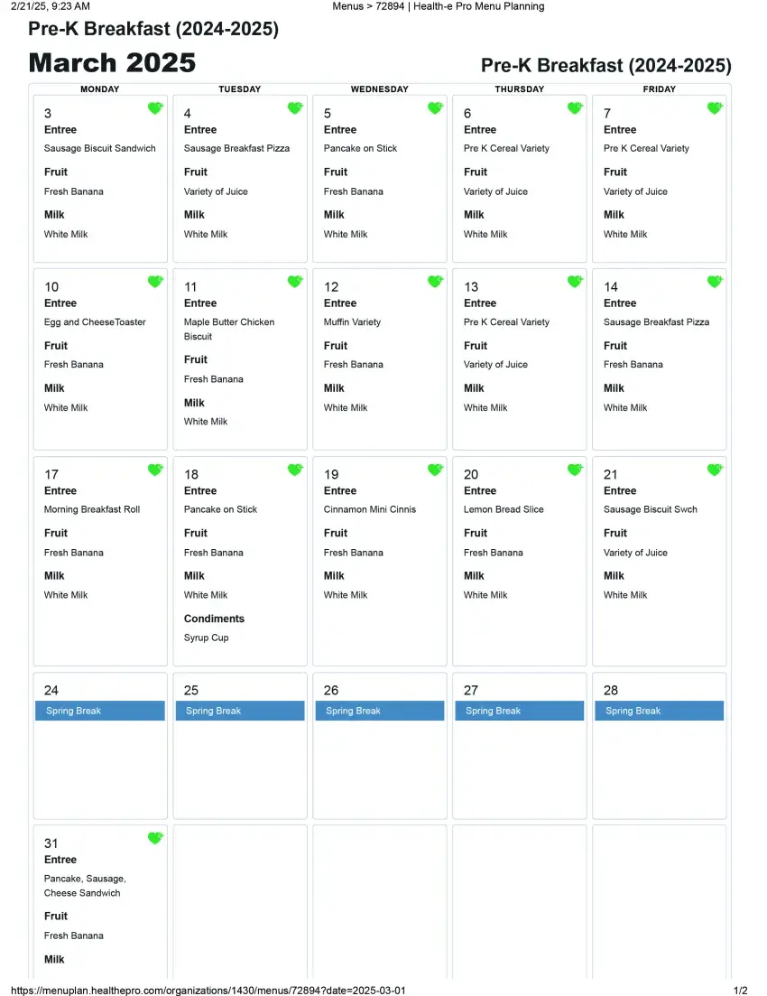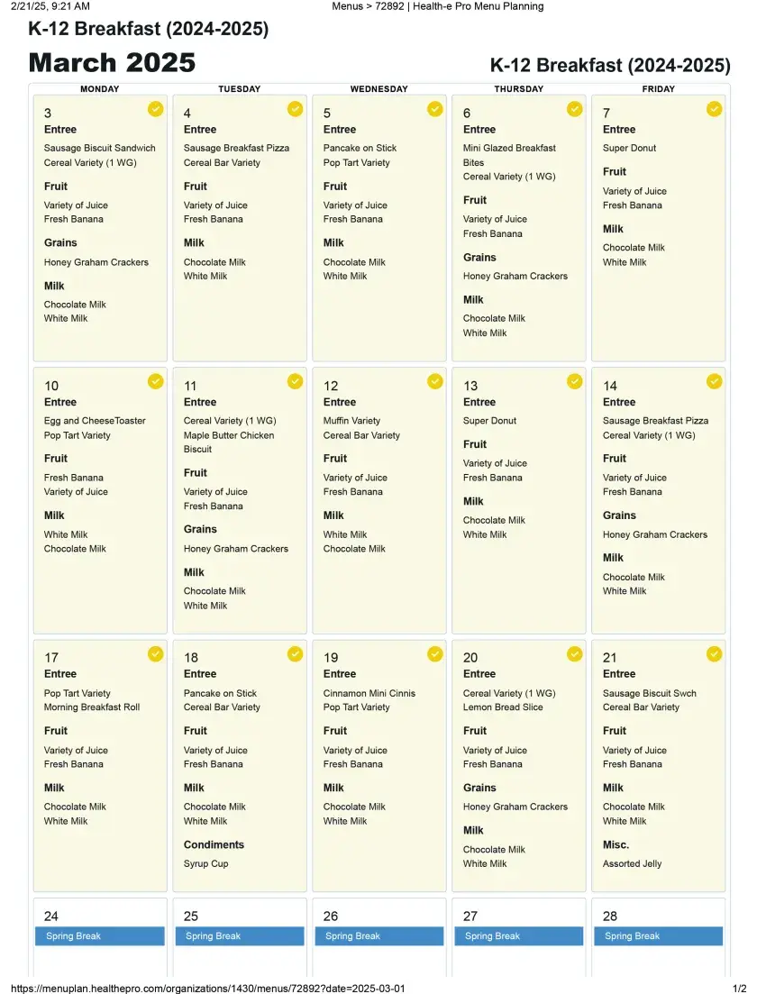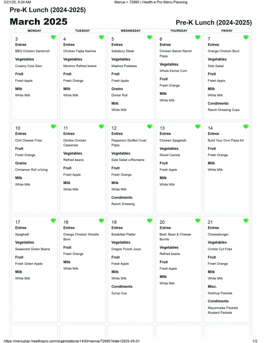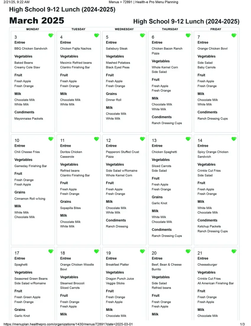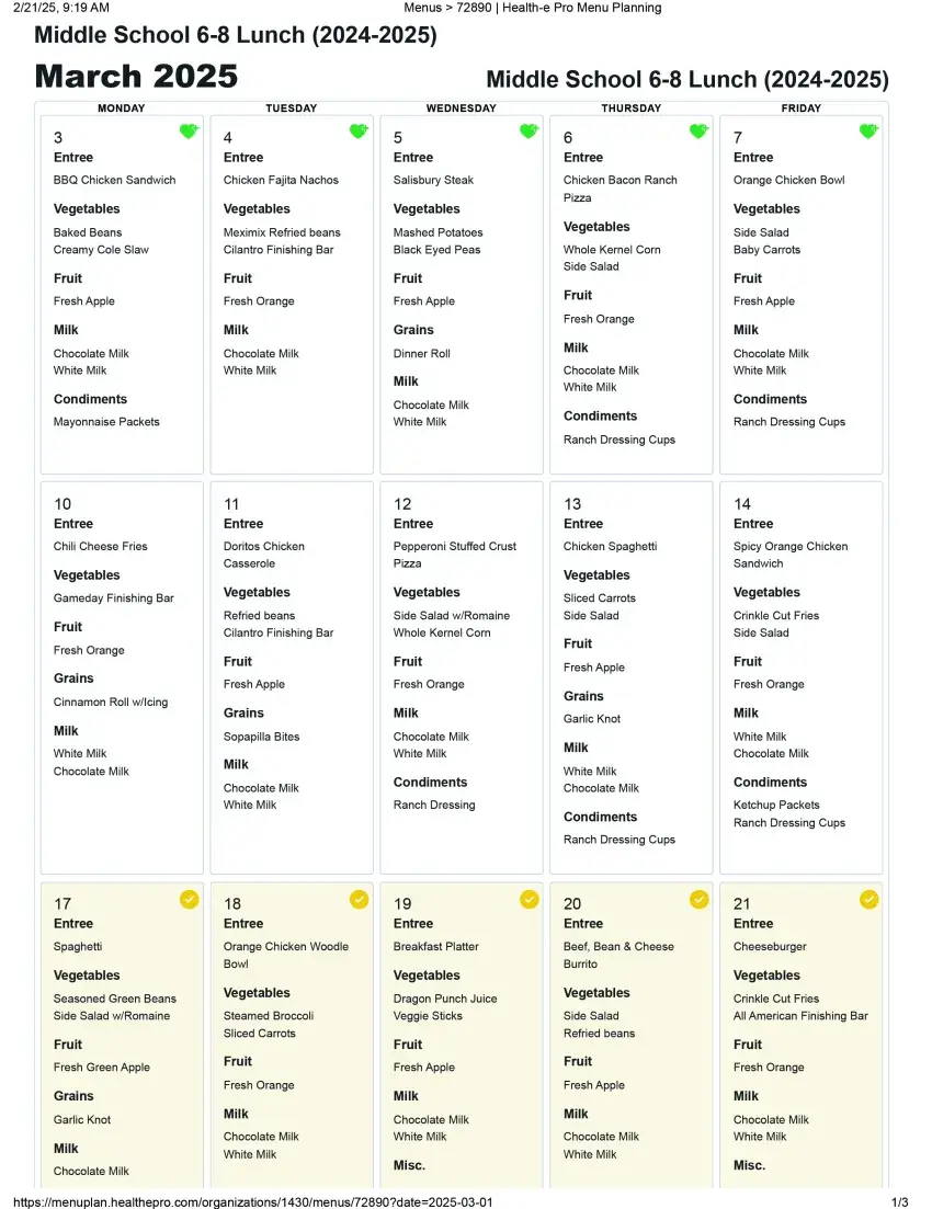 Monday, March 3- Entree: BBQ Chicken Sandwich, Vegetables: Baked Beans, Creamy Cole Slaw, Fruit: Fresh Apple, Fresh Orange, Milk: Chocolate Milk, White Milk, Condiments: Mayonnaise Packets.