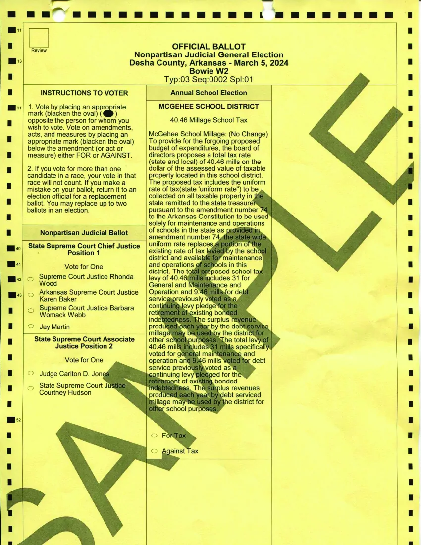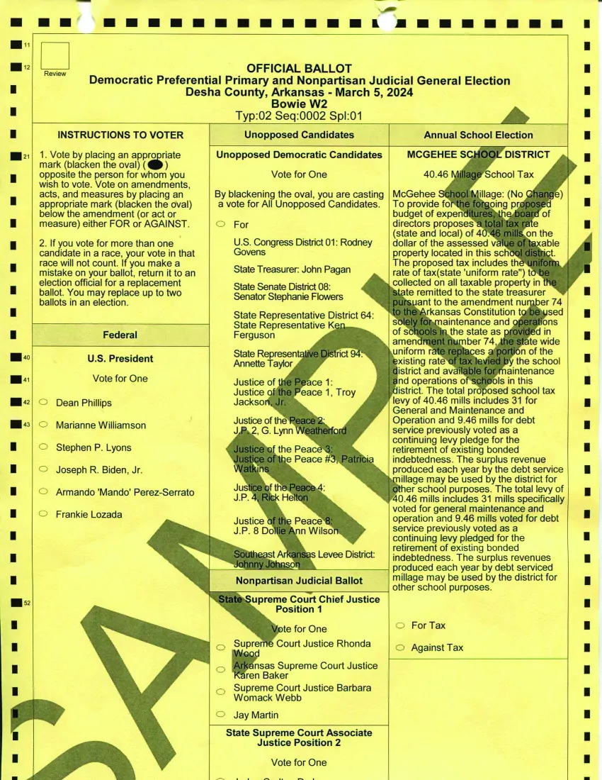 Early voting will be available at the Desha County Court House until Monday, March 4, 2024 from 8 am-6 pm and Saturday from 10-4 and Saturday, March 2 from 10 am -4 pm. Early in person voting for local areas will be available until Saturday, March 2, 2024 at Dumas Community Center and McGehee Municipal Building. The following locations will be available on election day from 7:30 am to 7:30 pm on March 5, 2024 at the Dumas Community Center, Watson, Reed, McGehee Men’s Club, St Peters Rock, Mitchellville, Arkansas City Hall, and McGehee Municipal Building/