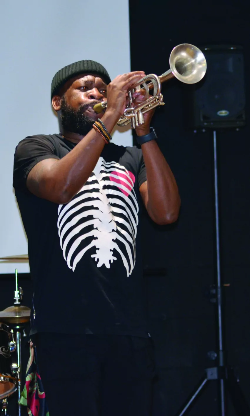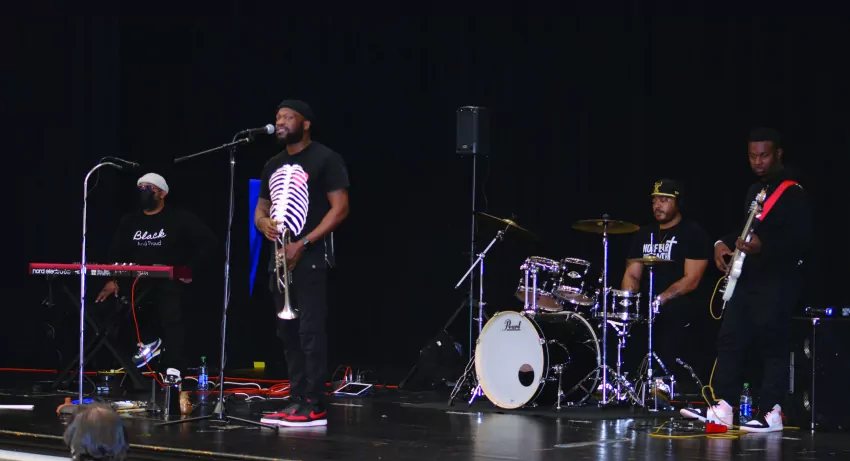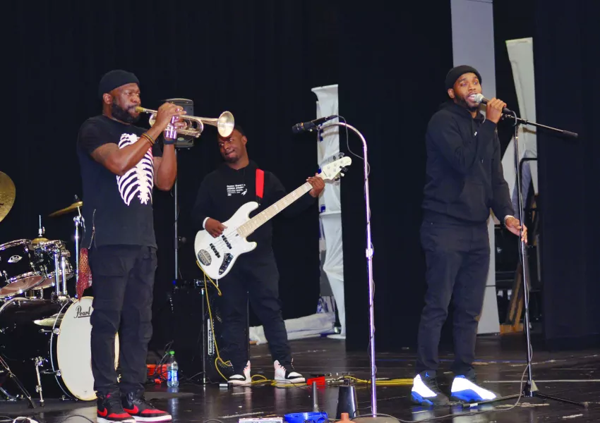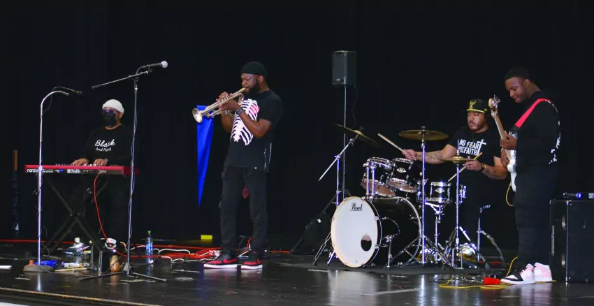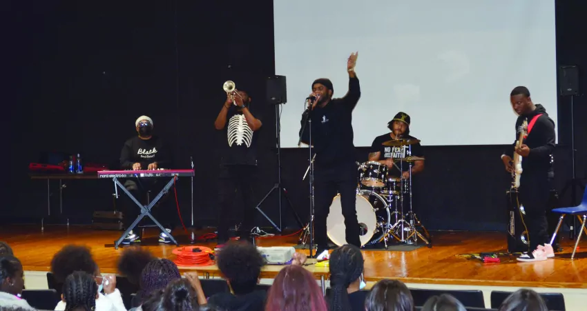 Rodney Block, trumpet; Roosevelt Harris, vocalist; Dre Franklin, piano; D'Shawn Lampkin, bass guitar; and Jonathan Burks on drums performed a variety of music styles including Jazz, Afrobeats, R&B and Gospel. The audience danced and sang to several songs including “This Little Light of Mine.” Blocked talked to the students about how his roots began in gospel music and started playing his trumpet in band. He advised the students to listen to a variety of music and that band and choir is often where a music career begins. Block said learning never ends and that people in a variety of professions have graduated from Dumas High School. He advised students to lead with kindness and love in your heart; make good decisions and try hard to resolve conflict without violence.