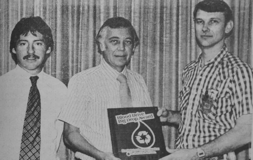 Sunbeam plant in Dumas was honored Tuesday for its contribution to the Red Cross blood program for allowing public drawings to be held there and allowing the Sunbeam employees time from their jobs to participate as donors. At the presentation of a plaque for Sunbeam were from left, Harry Morton, Red Cross field representative for the blood program, John Hartson, Sunbeam plant manager, and Tommy Peacock, chairman of the blood program here.