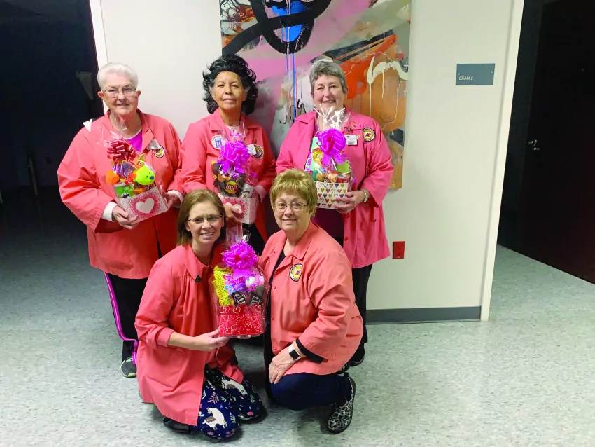 Red, pink, white, what a site it was! Monday, January 17th when five auxilians gathered to make adorable Valentine items to be sold in the Hospital Gift Shop. Pictured (standing) Lillie Ross, Patty Posey and Clarice Poole. Others pictured are Lorra Kelley and Shirley Sandlin. The auxilians assembled coke packs, candy bar bouquets, and an array of various candies.