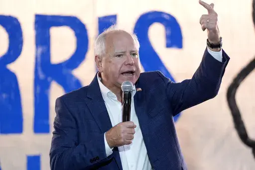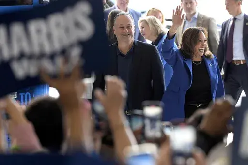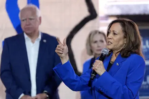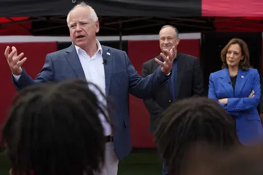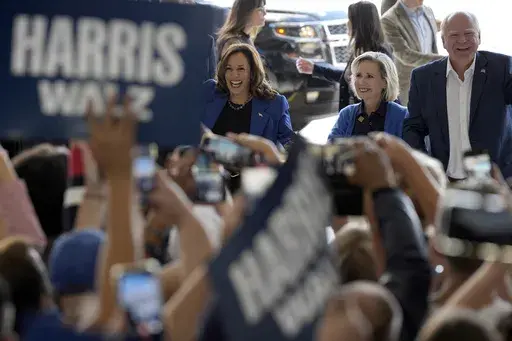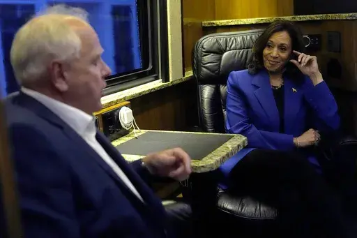 ROCHESTER, Pa. (AP) — Democratic presidential nominee Kamala Harris and running mate Tim Walz gave pep talks to campaign volunteers and a high school football team Sunday, with their bus tour in a corner of Pennsylvania serving as a modest, small-town version of the grand rally she's expected to have at the Democratic nominating convention in Chicago this week.