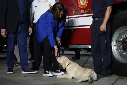 The vice president next stopped at a firehouse in Aliquippa, where she met firefighters, petted the station's dog and gave the crew almond pastries, before heading to a nearby high school, she and Walz met with the local football coach and addressed the team, who kneeled on the field to listen.