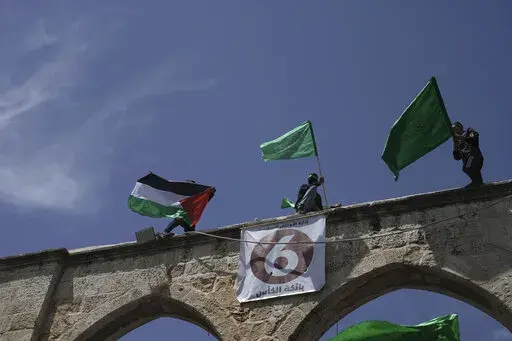 After prayers, a small group of Palestinians waving Hamas flags marched in protest and tried to break into an empty police post inside the compound. The police used a drone to drop tear gas on them, sending crowds of people scattering across the esplanade.