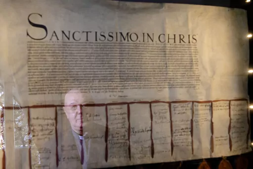 At the end of the interview, Pagano proudly showed visitors one of the archive’s prized possessions, which he keeps in an otherwise nondescript wooden armoire near the entrance of his office. There, behind plate glass and illuminated with special lights, is the original 1530 letter from British nobles urging Pope Clement VII to grant King Henry VIII an annulment so he could marry Anne Boleyn.