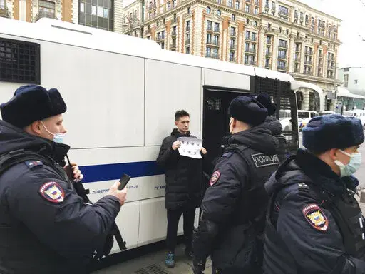 Another court ruled against Moscow student Dmitry Reznikov for displaying a blank piece of paper with eight asterisks, which could have been interpreted as standing for “No to war” in Russian -- a popular chant by protesters. The court found him guilty of discrediting the armed forces and fined him 50,000 rubles ($618) for holding the sign in central Moscow in a mid-March demonstration that lasted only seconds before police detained him.