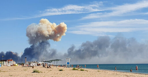KYIV, Ukraine (AP) — Powerful explosions rocked a Russian air base in Crimea and sent towering clouds of smoke over the landscape Tuesday in what may mark an escalation of the war in Ukraine. At least one person was killed and several others were wounded, authorities said.