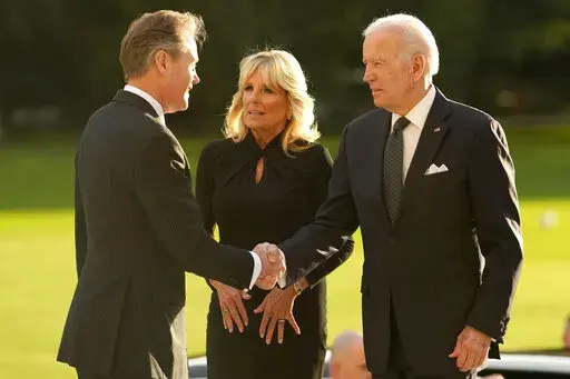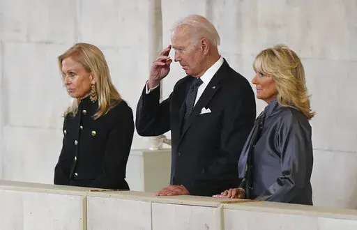 Biden traveled to Westminster Hall in London where the queen is lying in state. He made the sign of the cross Sunday and put his hand to his heart as he stood quietly near the casket. The Bidens were joined by U.S. Ambassador Jane Hartley.