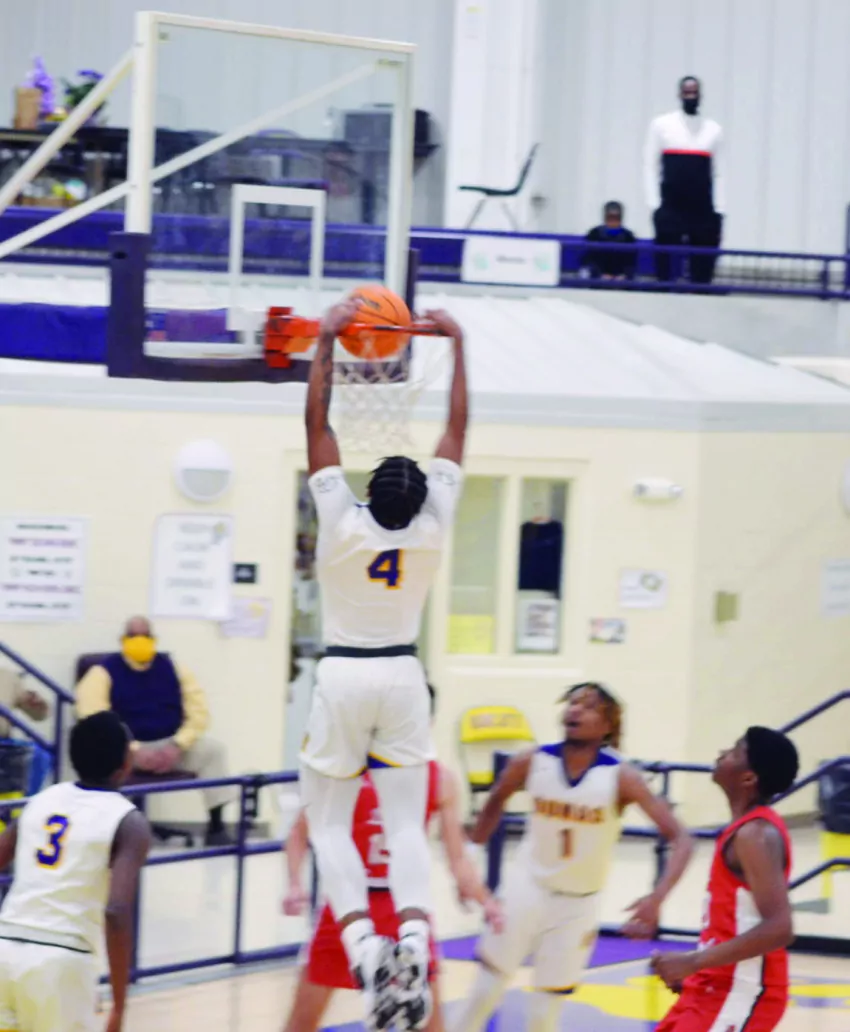 (#2) senior Derrick Lee made a basket, while (#3) sophomore Jayden Craney made two points and (#40) sophomore Tayveon Wilson scored two points to set the final score at Dumas 56, Drew Central 32.