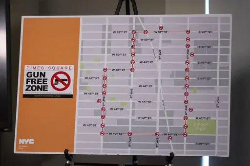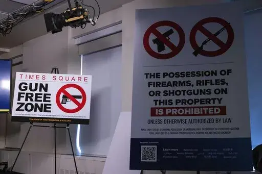 NEW YORK (AP) — Amid the bright lights and electronic billboards of New York's Times Square, city authorities are posting signs proclaiming the bustling crossroads a “Gun Free Zone.”