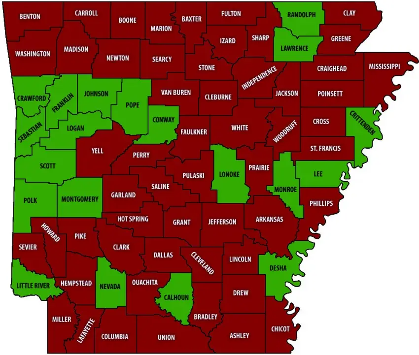 Burn ban counties as of March 30, 2026Arkansas, Ashley, Baxter, Benton, Boone, Bradley, Carroll, Chicot, Clark, Clay, Cleburne, Cleveland, Columbia, Craighead, Cross, Dallas, Drew, Faulkner, Fulton, Garland, Grant, Greene, Hempstead, Hot Spring, Howard, Independence, Izard, Jackson, Jefferson, Lafayette, Lincoln, Madison, Marion, Miller, Mississippi, Newton, Ouachita, Perry, Phillips, Pike, Poinsett, Prairie, Pulaski, Saint Francis, Saline, Searcy, Sevier, Sharp, Stone, Union, Van Buren, Washington, White, Woodruff, and Yell.