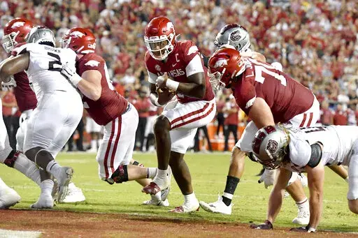 Alabama transfer linebacker Drew Sanders has 28 tackles for Arkansas and is tied for the national lead with 5 1/2 sacks. The Razorbacks' eight sacks last week against Missouri State were their most in a game since 2012.