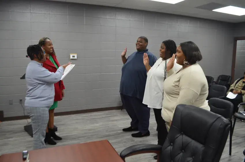 Norma Esaw, City of Dumas reporter/treasurer, swore in Edgar Spinks, Tirah McGehee, and Claudia Richie as the first three members of the newly formed youth Council.