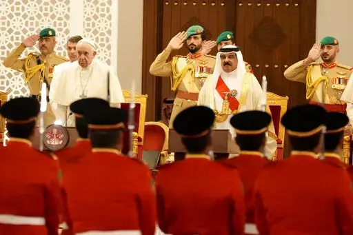 Francis referred indirectly to the sectarian strife as he arrived in the desert town of Awali and met with Al Khalifa at the Sakhir royal palace in the first-ever papal visit to Bahrain. Speaking to government authorities and diplomats from the palace's glistening courtyard, Francis praised Bahrain’s tradition of tolerance and cited Bahrain's constitution, which forbids discrimination on the basis of religion, as a stated commitment that needs to be put into practice.