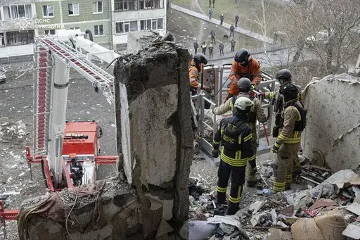 KYIV, Ukraine (AP) — A Russian drone blasted a hole in an apartment building in northeastern Ukraine during a nighttime attack, killing at least six people and wounding nine others, officials said Thursday.
