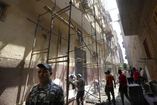 The street where Martyr Abu Sefein church is located remained cordoned off Monday as construction workers worked to clear away debris.