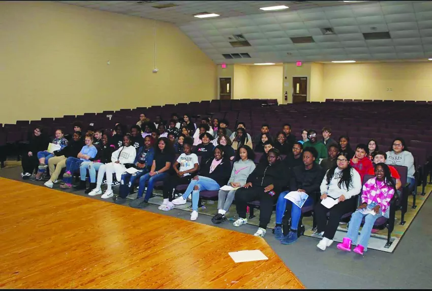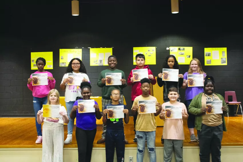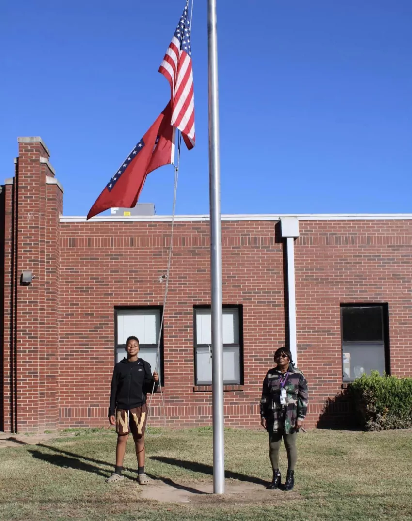Doris Huggins, 7th grade Social Studies teacher at Dumas Middle School was celebrated this week as a United States Army Veteran. Here, she is pictured with one of her scholars as she teaches him how to post the flag each morning.