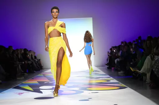 Hudson, who has dressed the likes of Beyoncé and Michelle Obama, borrowed inspiration from artist Jason Naylor’s colorful and borderline psychedelic murals for New York Fashion Week in an eclectic celebration of energy.