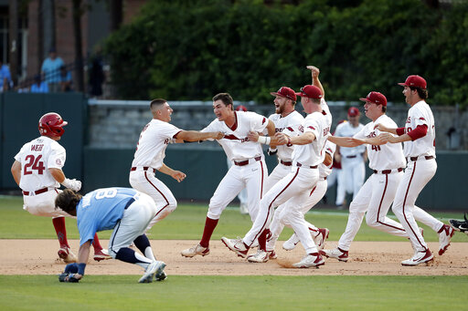 CHAPEL HILL, N.C. (AP) — Brady Slavens hit a walk-off single Sunday to give Arkansas a 4-3 win over North Carolina and the Razorbacks swept the best-of-three Chapel Hill Super Regional.