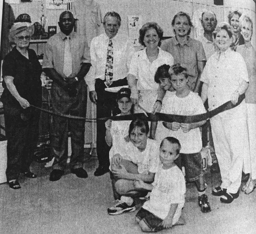 Linda Weatherford and Suzette Ross opened Inks ‘n’ Threads, a screen printing business, on Friday, August 2, with ribboncutting ceremonies at the store. On hand for the grand opening from left, Carolyn Potter, T. C. Pickett, Mayor Clay Oldner, Linda Weatherford, Suzette Ross, Doug Weatherford, Rhonda Beatty, Sue Wood, and Ramona Weatherford.