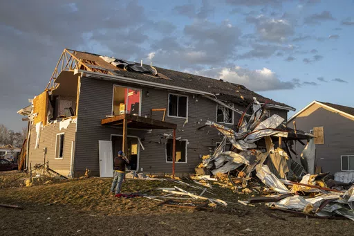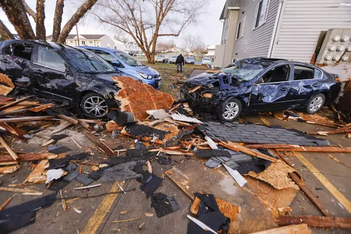 One tornado veered just west of Iowa City, home to the University of Iowa. Video from KCRG-TV showed toppled power poles and roofs ripped off an apartment building in the suburb of Coralville and significantly damaged homes in the city of Hills.