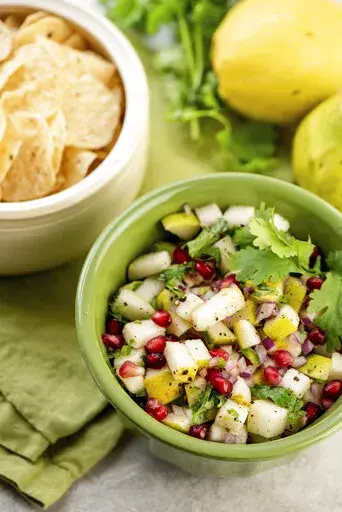In a medium bowl, combine 2 diced ripe-but-firm pears, a minced ½ red onion, a couple of tablespoons pomegranate seeds, 1 teaspoon minced jalapeno, 1 tablespoon minced fresh cilantro, 1 tablespoon lemon juice, 1 tablespoon orange juice, and salt and pepper to taste.