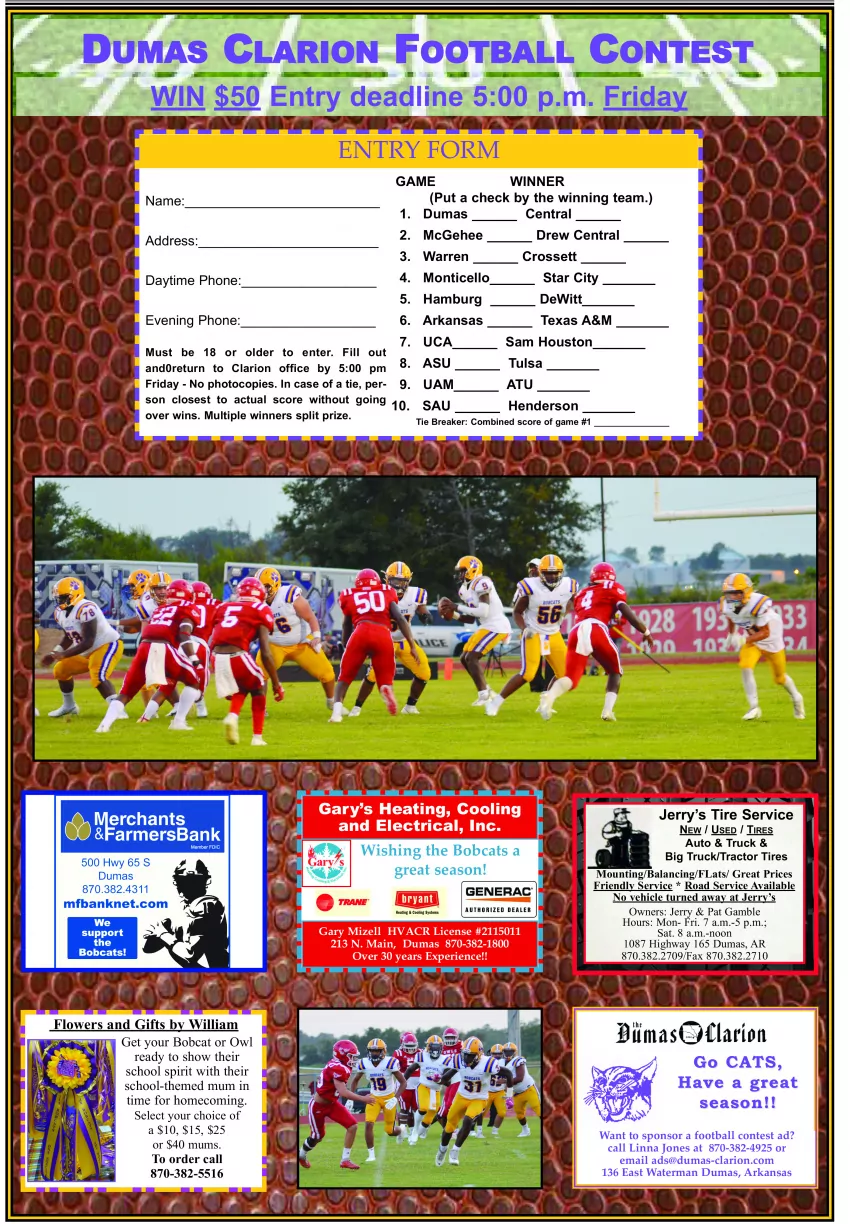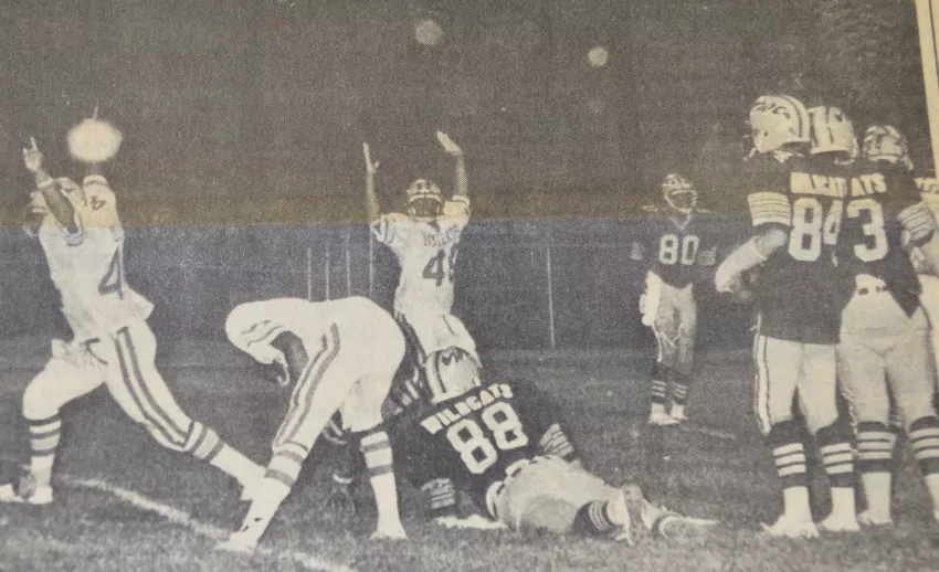 There were marked differences in attitudes Friday night when Ronnie Joe McKenzie (left) booted a 24-yard field goal that proved the difference as Dumas topped Watson Chapel, 10-7, on the road, McKenzie and his teammates indicate their excitement, while several Wildcats glumly look at the scoreboard. McKenzie had to kick the three pointer twice, making good both times.