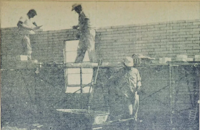 Mack Edmonds, left, and Charles Edmonds, both of Star City, start the final three “rounds” of bricks on the new Legion Hut at Memorial Park. The brick layers started Monday, August 31, and wound up the work on Saturday, afternoon.