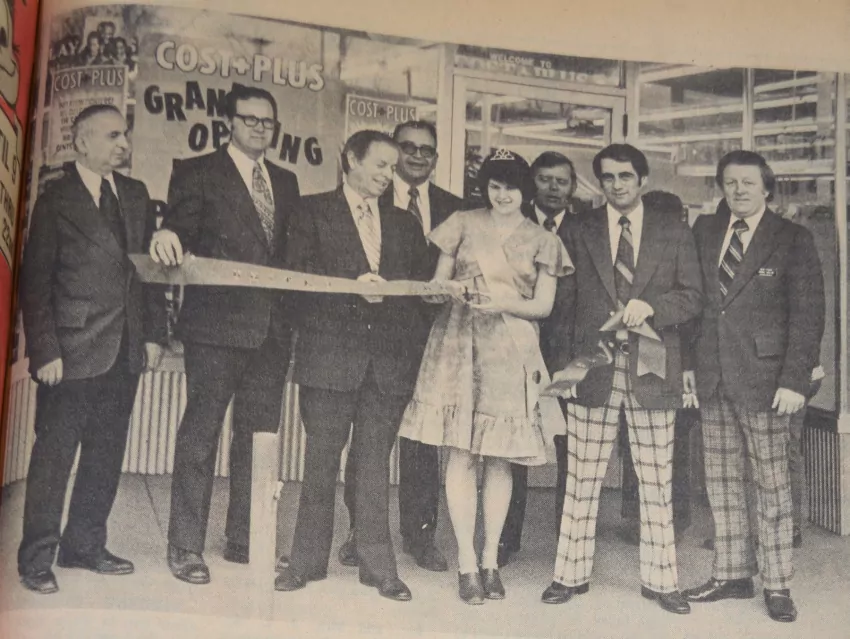 United Cost Plus store in Dumas was officially opened Wednesday morning with a ribbon cutting ceremony. Officials of United, Mayor Billy Free . and Charlotte Corker, Miss Dumas, officiated in the ribbon cutting. shown from left are Harry Phillips, Merchandise vice president; Joe T. Robinson, store manager; Mayor Free; Tom Ollie, administrative vice president; Jim Freeman, administrative assistant to the president; Pete Slager, executive vice president, and Herb Selak, director of merchandising.
