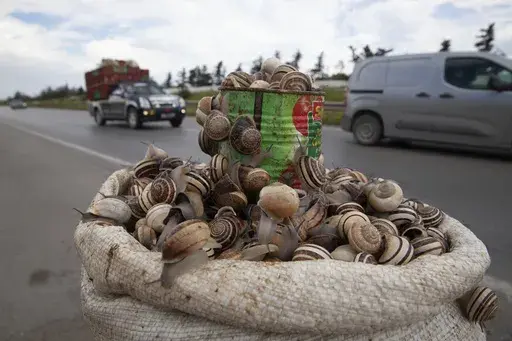 AKOUDA, Tunisia (AP) — In fields outside their hometown in central Tunisia, an increasing number of unemployed young men are seeking a new way to make a living, picking snails off of rocks and leaves and collecting them in large plastic bags to take to the local market to be sold.