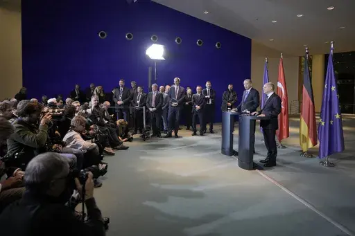 BERLIN (AP) — Turkish President Recep Tayyip Erdogan and German Chancellor Olaf Scholz on Friday aired deep differences over the war between Israel and Hamas as the Turkish leader made a brief and tensely anticipated visit to Berlin.
