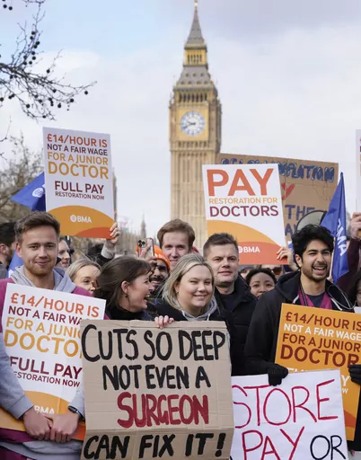 LONDON (AP) — Tens of thousands of junior doctors went on strike across England on Monday to demand better pay, kicking off three days of widespread disruption at the U.K.'s state-funded hospitals and health clinics.