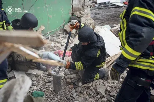 The strike by a Shahed drone in the northern Sumy region late Monday hit a dormitory of an educational facility in the town of Hlukhiv and wounded 11 others, including two children, authorities said, adding that more people could be trapped under the rubble.