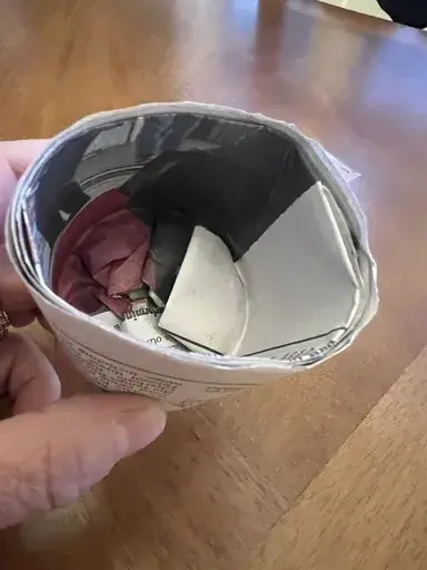 Fold the excess newspaper in at the base of the can, set the wrapped can right-side-up and press it firmly against a flat surface like a table or counter to fortify the bottom of your new pot. If necessary, use a small piece of tape to secure the bottom.