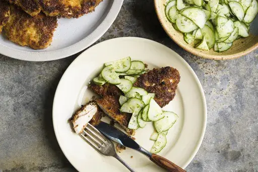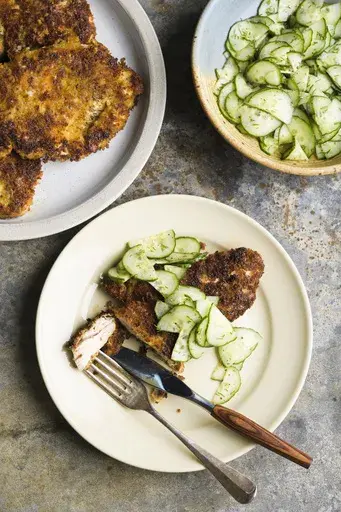 In a 12-inch skillet over medium-high, heat 6 tablespoons of oil until shimmering. Add 2 cutlets and cook undisturbed until golden brown, 1 to 2 minutes. Using tongs, flip and cook until the second sides are golden brown, about 1 minute. Remove the skillet from the heat. Transfer the cutlets to the second prepared rack. Repeat with the remaining 4 tablespoons oil and remaining cutlets, adjusting the heat as needed if the cutlets brown too quickly. Serve with the cucumber salad.